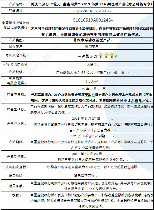 3.中国建设银行重庆市分行可根据市场情况等调整产品规模上、下限,并最迟于调整规模上下限当日进行公告。