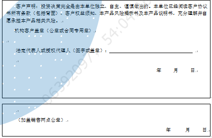 客户签名:                                    客户声明:投资决策完全是由客户独立、自主、谨慎做出的。客户已经阅读客户协议书所有条款(包括背面)、客户权益须知、本产品风险揭示书及本产品说明书,充分理解并自愿承担本产品相关风险。)