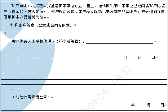 客户签名: ( 客户声明:投资决策完全是由客户独立、自主、谨慎做出的。客户已经阅读客户协议书所有条款(包括背面)、客户权益须知、本产品风险揭示书及本产品说明书,充分理解并自愿承担本产品相关风险。)