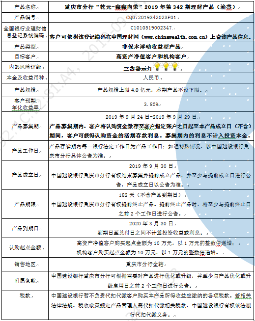 2019年第342期理财产品说明书