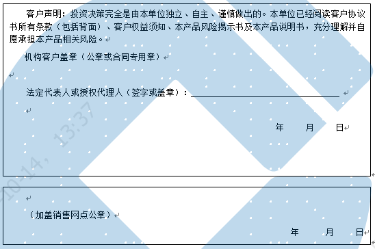 客户签名: ( 客户声明:投资决策完全是由客户独立、自主、谨慎做出的。客户已经阅读客户协议书所有条款(包括背面)、客户权益须知、本产品风险揭示书及本产品说明书,充分理解并自愿承担本产品相关风险。)