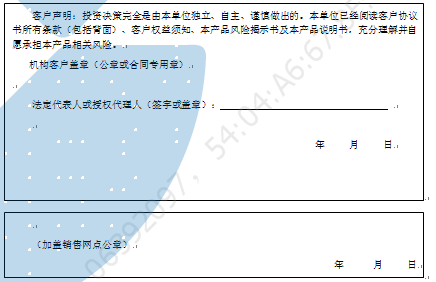 客户签名:                                    客户声明:投资决策完全是由客户独立、自主、谨慎做出的。客户已经阅读客户协议书所有条款(包括背面)、客户权益须知、本产品风险揭示书及本产品说明书,充分理解并自愿承担本产品相关风险。)