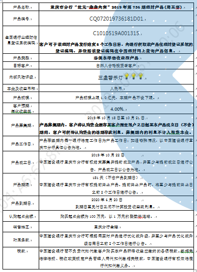 中国建设银行重庆市分行“乾元-鑫鑫向荣” 2019年第736期理财产品风险揭示书和产品说明书