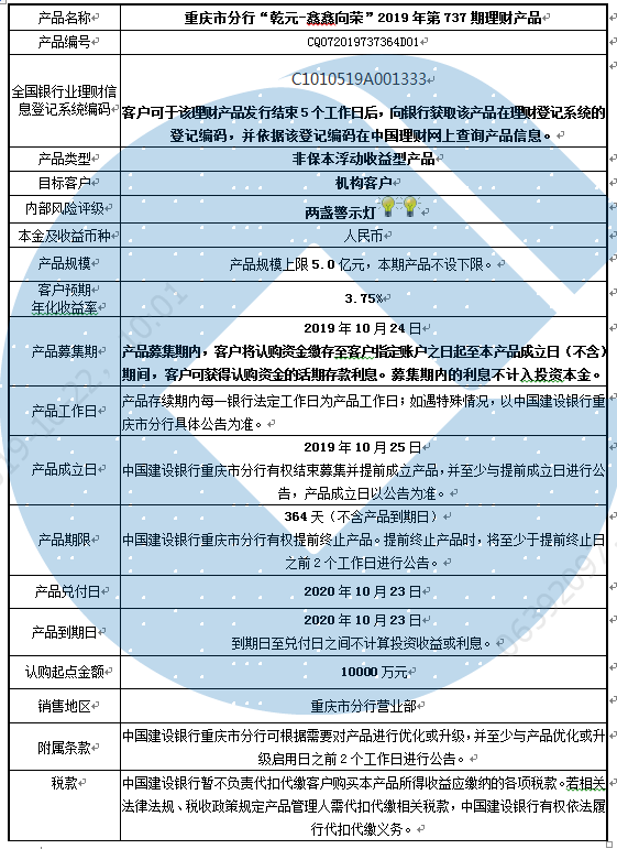 中国建设银行重庆市分行“乾元-鑫鑫向荣” 2019年第737期理财产品风险揭示书和产品说明书