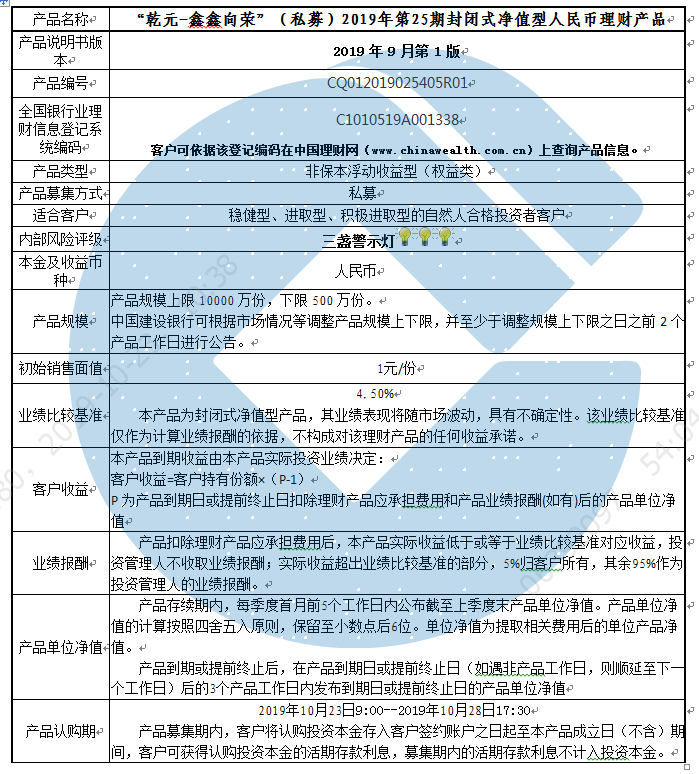 2019年第25期封闭式净值型人民币理财产品说明书
