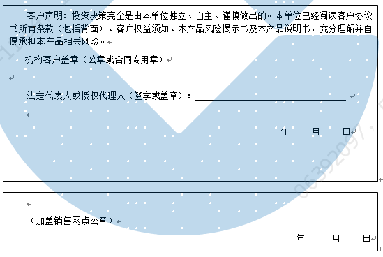 客户签名: ( 客户声明:投资决策完全是由客户独立、自主、谨慎做出的。客户已经阅读客户协议书所有条款(包括背面)、客户权益须知、本产品风险揭示书及本产品说明书,充分理解并自愿承担本产品相关风险。)