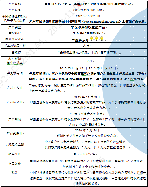 3.中国建设银行重庆市分行可根据市场情况等调整产品规模上、下限,并最迟于调整规模上下限当日进行公告。