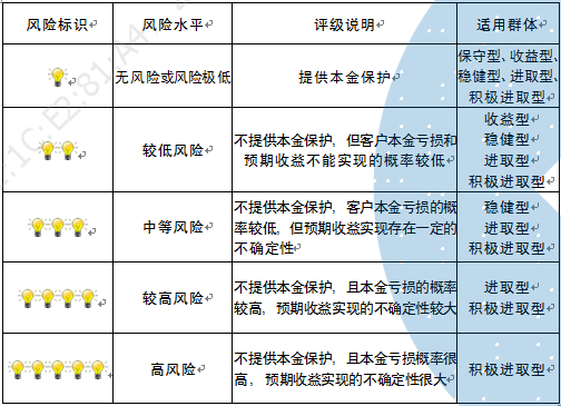本产品为非保本浮动收益型理财产品,不保证本金和收益,请您充分认识投资风险,谨慎投资。本期产品期限为127天(中国建设银行有权对产品进行展期或提前终止),存续期内,产品不接受申购或赎回申请。本期产品内部风险评级级别为三盏警示灯 ,风险水平属于中等风险。最不利情况下,您将损失全部收益甚至包括全部本金。本理财产品适用于稳健型、进取型 、积极进取型客户。