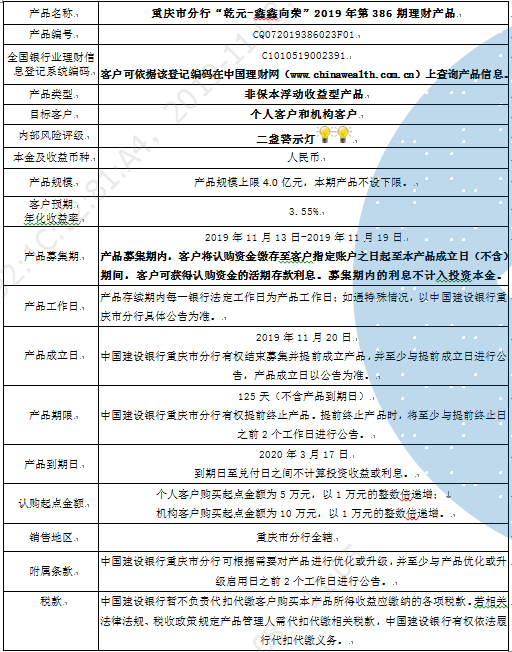 .客户预期年化收益率的测算依据:中国建设银行重庆市分行将募集资金投资于资产组合型人民币理财产品项下的债权类资产、债券和货币市场工具类资产及其他符合监管要求的资产组合,通过资产组合管理实现安全性、流动性与收益性的平衡,测算出客户预期年化收益率为3.55%/年。