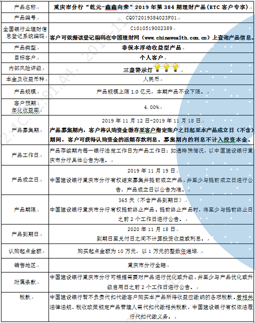 3.中国建设银行重庆市分行可根据市场情况等调整产品规模上、下限,并最迟于调整规模上下限当日进行公告。
