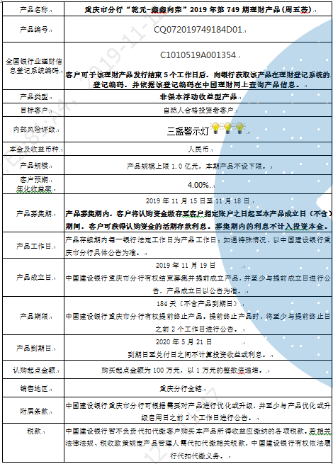 中国建设银行重庆市分行“乾元-鑫鑫向荣” 2019年第749期理财产品风险揭示书和产品说明书