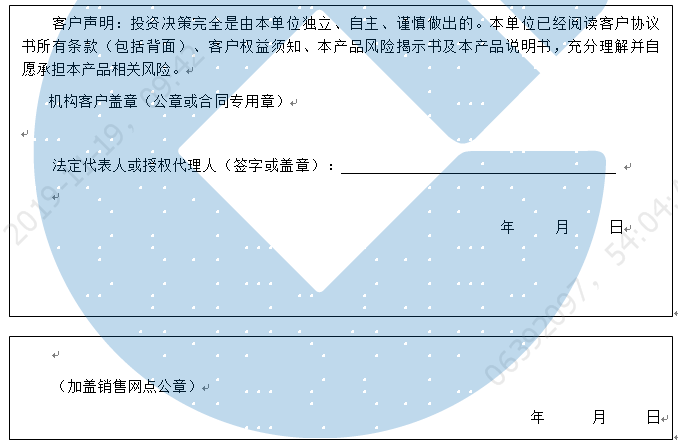 客户签名:                                    客户声明:投资决策完全是由客户独立、自主、谨慎做出的。客户已经阅读客户协议书所有条款(包括背面)、客户权益须知、本产品风险揭示书及本产品说明书,充分理解并自愿承担本产品相关风险。)