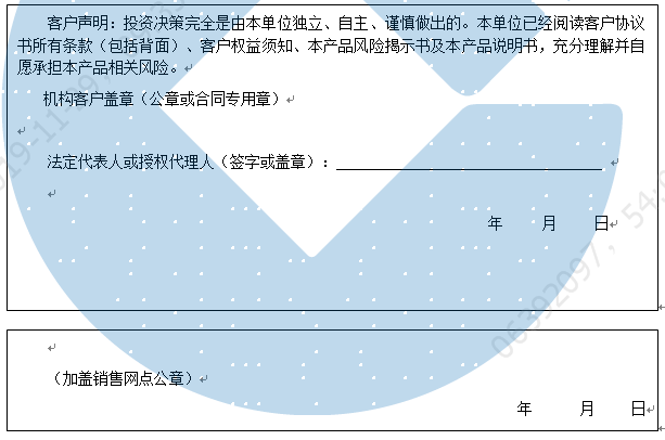 客户签名:                                    客户声明:投资决策完全是由客户独立、自主、谨慎做出的。客户已经阅读客户协议书所有条款(包括背面)、客户权益须知、本产品风险揭示书及本产品说明书,充分理解并自愿承担本产品相关风险。)