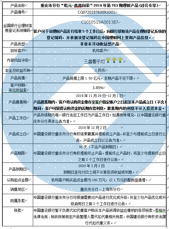 中国建设银行重庆市分行“乾元-鑫鑫向荣” 2019年第763期理财产品风险揭示书和产品说明书