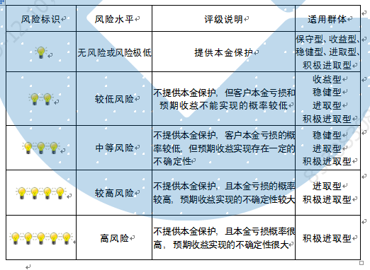 本产品为非保本浮动收益型理财产品,不保证本金和收益,请您充分认识投资风险,谨慎投资。本期产品期限184天(中国建设银行有权对产品进行展期或提前终止),存续期内,产品不接受申购或赎回申请。本期产品内部风险评级级别为盏警示灯,风险水平属于中等风险。最不利情况下,您将损失全部收益甚至包括全部本金。本理财产品适用于稳健型进取型 积极进取型客户。