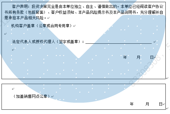 客户签名:                                    客户声明:投资决策完全是由客户独立、自主、谨慎做出的。客户已经阅读客户协议书所有条款(包括背面)、客户权益须知、本产品风险揭示书及本产品说明书,充分理解并自愿承担本产品相关风险。)
