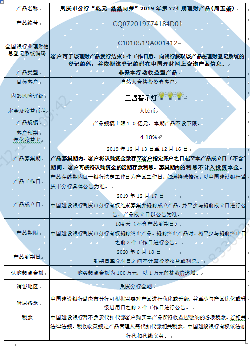 中国建设银行重庆市分行“乾元-鑫鑫向荣” 2019年第774期理财产品风险揭示书和产品说明书