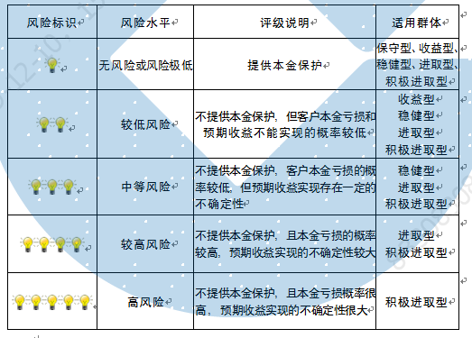 本产品为非保本浮动收益型理财产品,不保证本金和收益,请您充分认识投资风险,谨慎投资。本期产品期限为127天(中国建设银行有权对产品进行展期或提前终止),存续期内,产品不接受申购或赎回申请。本期产品内部风险评级级别为盏警示灯 ,风险水平属于中等风险。最不利情况下,您将损失全部收益甚至包括全部本金。本理财产品适用于稳健型、进取型 积极进取型客户。