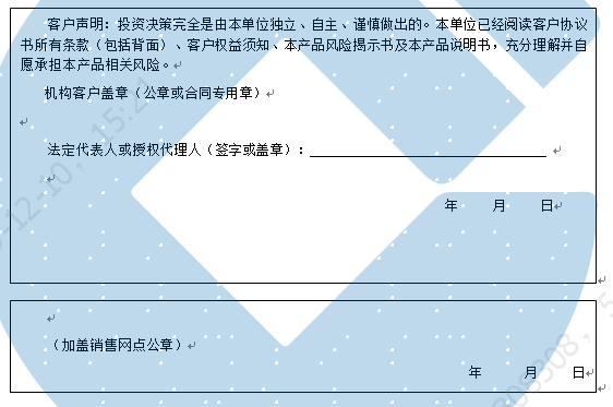 客户签名:                                    客户声明:投资决策完全是由客户独立、自主、谨慎做出的。客户已经阅读客户协议书所有条款(包括背面)、客户权益须知、本产品风险揭示书及本产品说明书,充分理解并自愿承担本产品相关风险。)