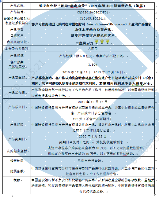 中国建设银行重庆市分行“乾元-鑫鑫向荣” 2019年第409期理财产品风险揭示书和产品说明书