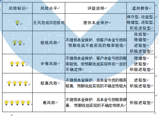本产品为非保本浮动收益型理财产品,不保证本金和收益,请您充分认识投资风险,谨慎投资。本期产品期限为125天(中国建设银行有权对产品进行展期或提前终止),存续期内,产品不接受申购或赎回申请。本期产品内部风险评级级别为盏警示灯 ,风险水平属于较低风险。最不利情况下,您将损失全部收益甚至包括全部本金。本理财产品适用于收益型、稳健型、进取型 积极进取型客户。
