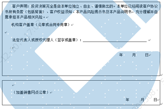 客户签名:                                    客户声明:投资决策完全是由客户独立、自主、谨慎做出的。客户已经阅读客户协议书所有条款(包括背面)、客户权益须知、本产品风险揭示书及本产品说明书,充分理解并自愿承担本产品相关风险。)