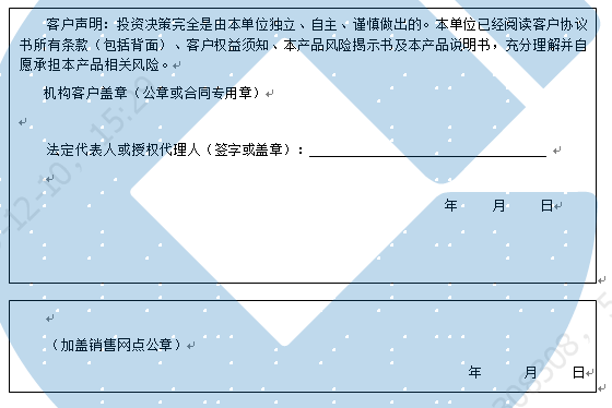 客户签名:                                    客户声明:投资决策完全是由客户独立、自主、谨慎做出的。客户已经阅读客户协议书所有条款(包括背面)、客户权益须知、本产品风险揭示书及本产品说明书,充分理解并自愿承担本产品相关风险。)