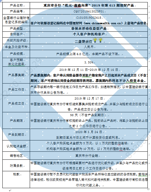 中国建设银行重庆市分行“乾元-鑫鑫向荣” 2019年第413期理财产品风险揭示书和产品说明书
