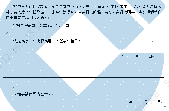 客户签名:                                    客户声明:投资决策完全是由客户独立、自主、谨慎做出的。客户已经阅读客户协议书所有条款(包括背面)、客户权益须知、本产品风险揭示书及本产品说明书,充分理解并自愿承担本产品相关风险。)