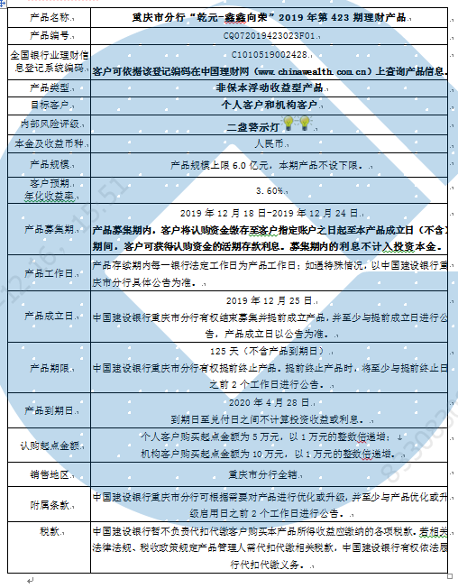 中国建设银行重庆市分行“乾元-鑫鑫向荣” 2019年第423期理财产品风险揭示书和产品说明书
