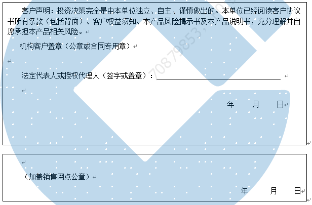 客户签名:                                    客户声明:投资决策完全是由客户独立、自主、谨慎做出的。客户已经阅读客户协议书所有条款(包括背面)、客户权益须知、本产品风险揭示书及本产品说明书,充分理解并自愿承担本产品相关风险。)