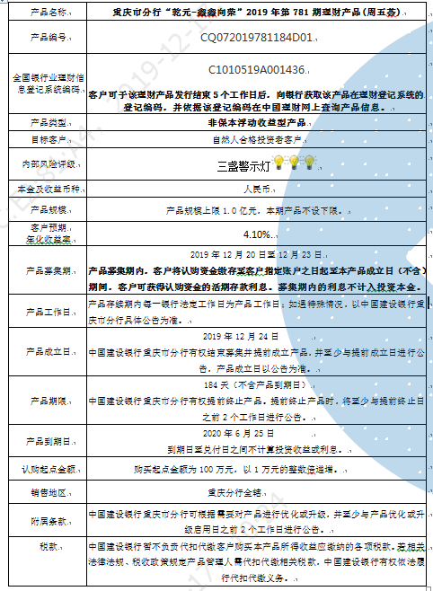 中国建设银行重庆市分行“乾元-鑫鑫向荣” 2019年第781期理财产品风险揭示书和产品说明书