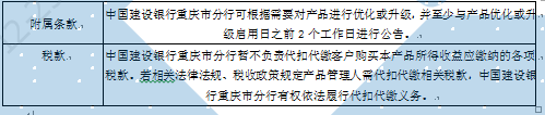 11.税收风险:中国建设银行重庆市分行暂不负责代扣代缴客户购买本产品所得收益应缴纳的各项税款。若相关税法法规规定产品管理人应代扣代缴相关税款,中国建设银行重庆市分行有权依法履行代扣代缴义务,则客户面临其取得的收益扣减相应税费的风险。此外,本产品预期年化收益率根据产品发行时现行法律法规、税收政策测算而得,税收法规的执行及修订可能对本产品投资运作等过程中需缴纳的相关税费产生影响,可能影响客户预期收益,甚至造成本金损失。