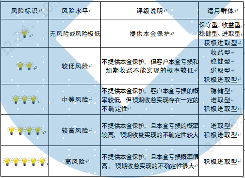本期产品内部风险评级级别为盏警示灯,风险程度属于中等风险产品适合于稳健型、进取型及积极进取型客户。最不利情况下,基础资产无法回收任何本金和收益,客户将损失全部本金。客户不得使用贷款、发行债券等筹集的非自有资金投资本产品。