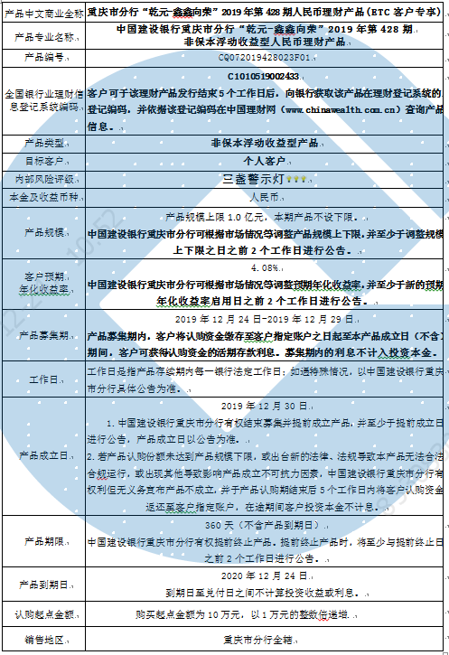 中国建设银行重庆市分行“乾元-鑫鑫向荣” 2019年第428期人民币理财产品风险揭示书和产品说明书