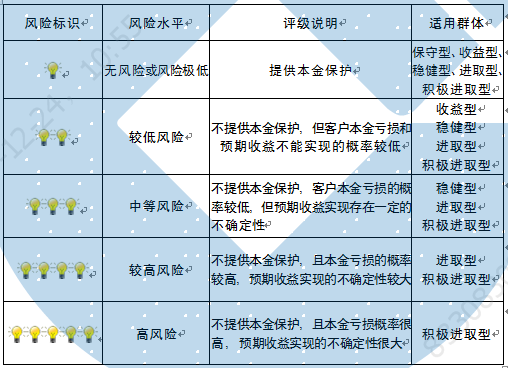 本期产品内部风险评级级别为三盏警示灯,风险程度属于中等风险。产品适合于稳健型、进取型及积极进取型客户。最不利情况下,基础资产无法回收任何本金和收益,客户将损失全部本金。客户不得使用贷款、发行债券等筹集的非自有资金投资本产品。