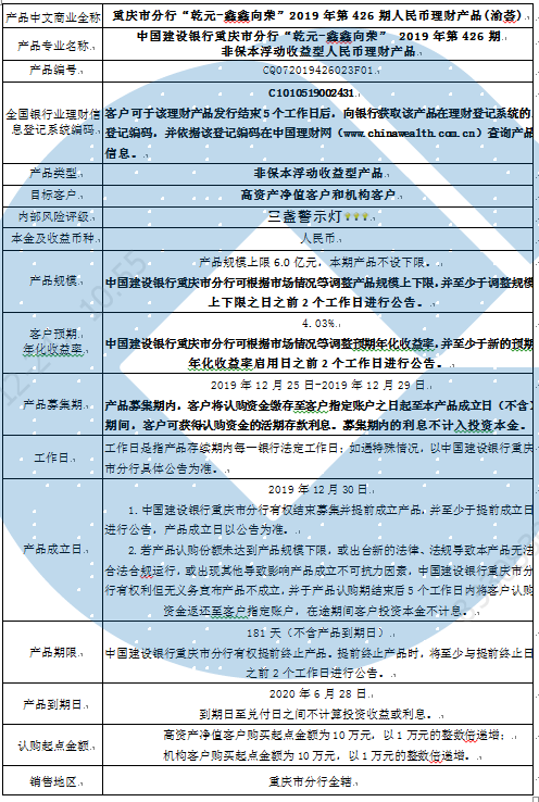 2.客户预期年化收益率的测算依据:中国建设银行重庆市分行将募集资金投资于资产组合型人民币理财产品项下的股权类、债权类资产、债券和货币市场工具类资产及其他符合监管要求的资产组合,通过资产组合管理实现安全性、流动性与收益性的平衡,测算出客户预期年化收益率为4.03%/年。
