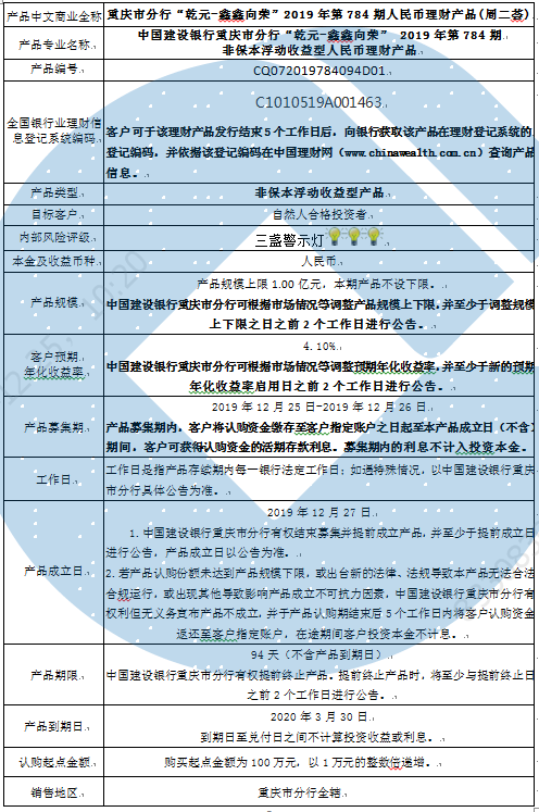 2019年第784期人民币理财产品说明书