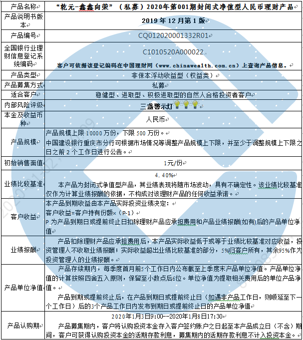 2020年第001期封闭式净值型人民币理财产品说明书