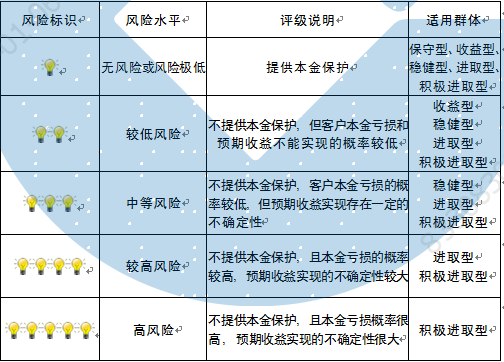 本期产品内部风险评级级别为三盏警示灯,风险水平属于中等风险。产品适合于稳健型、进取型 、积极进取型客户。最不利情况下,基础资产无法回收任何本金和收益,客户将损失全部本金。客户不得使用贷款、发行债券等筹集的非自有资金投资本产品。