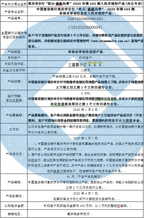 2020年第604期人民币理财产品说明书