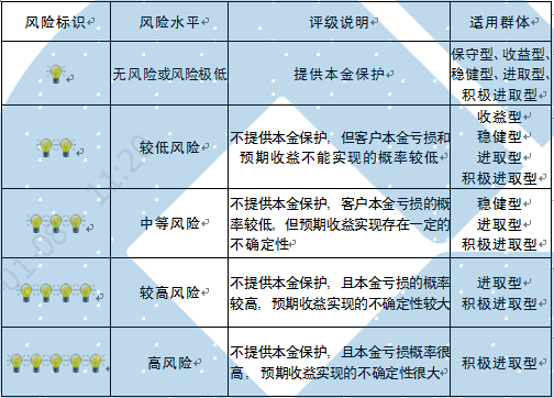 本期产品内部风险评级级别为两盏警示灯,风险程度属于较低风险。产品适合于收益型、稳健型、进取型及积极进取型客户。最不利情况下,基础资产无法回收任何本金和收益,客户将损失全部本金。客户不得使用贷款、发行债券等筹集的非自有资金投资本产品。