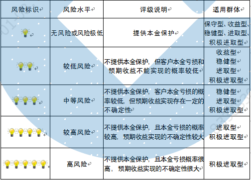 本期产品内部风险评级级别为盏警示灯,风险程度属于中等风险产品适合于稳健型、进取型及积极进取型客户。最不利情况下,基础资产无法回收任何本金和收益,客户将损失全部本金。客户不得使用贷款、发行债券等筹集的非自有资金投资本产品。